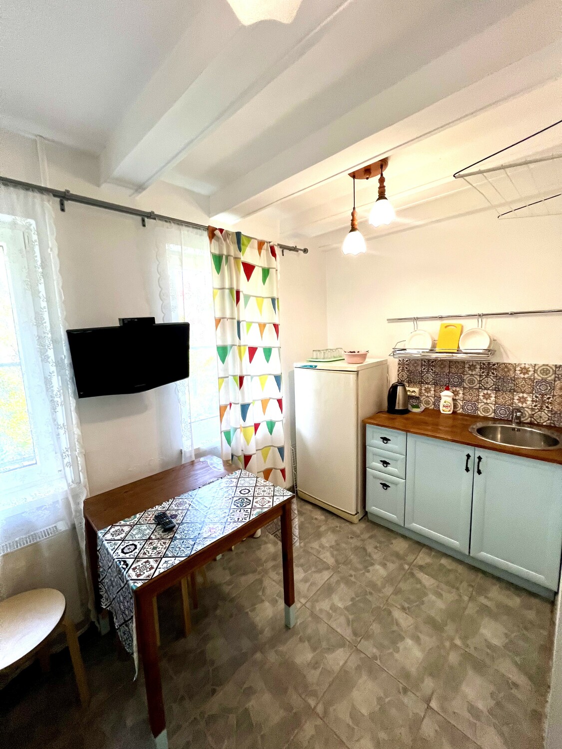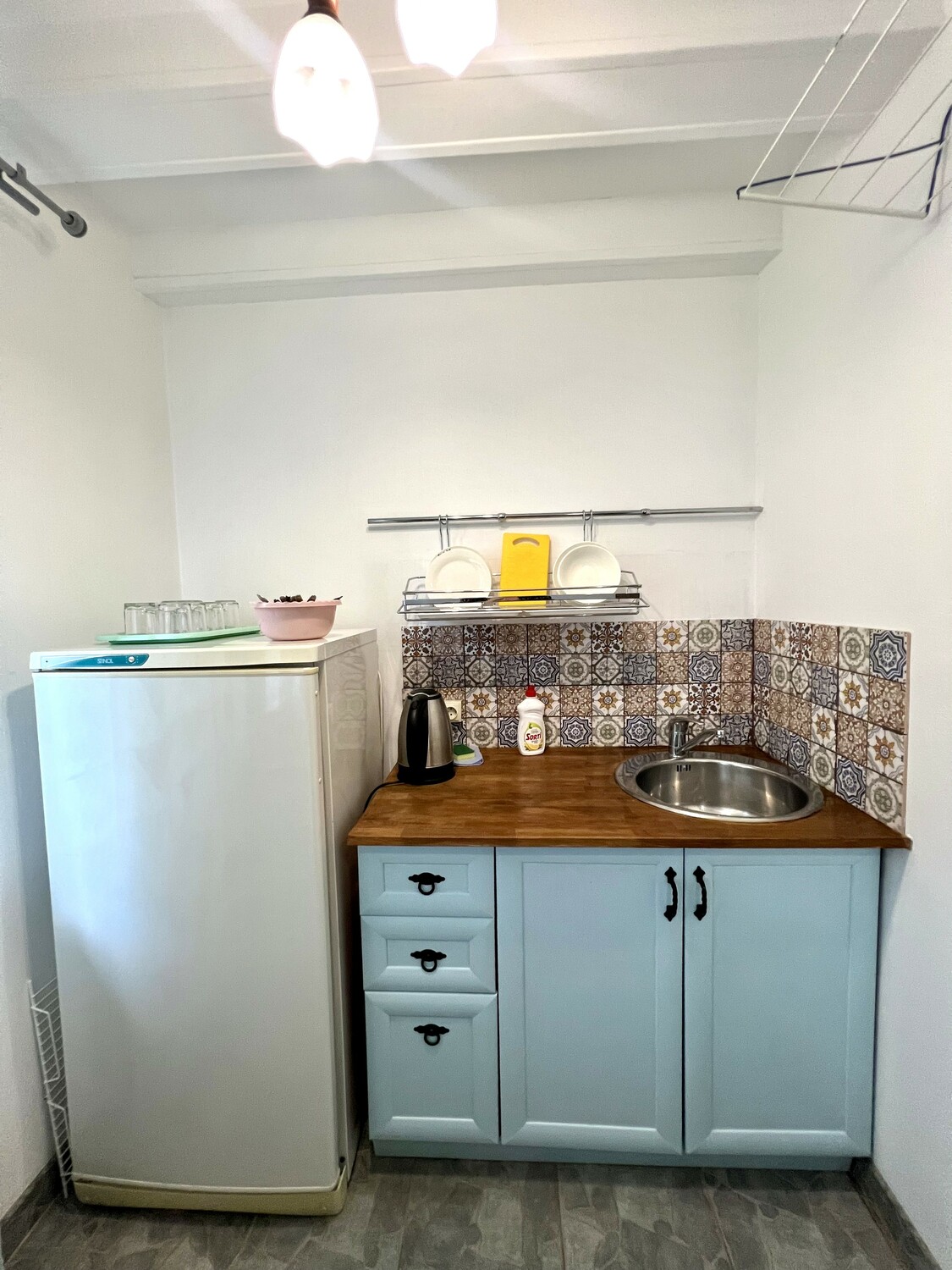 Кухня в мини-коттедже: большой холодильник, раковина, чайник, СВЧ печь, посуда